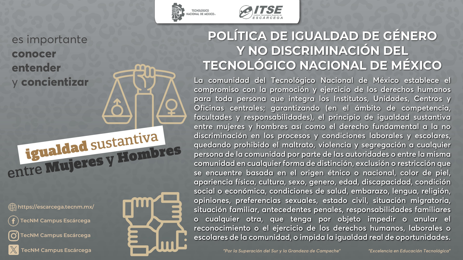 La comunidad del Tecnológico Nacional de México establece el compromiso con la promoción y ejercicio de los derechos humanos para toda persona que integra los Institutos, Unidades, Centros y Oficinas centrales; garantizando (en el ámbito de competencia, facultades y responsabilidades), el principio de igualdad sustantiva entre mujeres y hombres así como el derecho fundamental a la no discriminación en los procesos y condiciones laborales y escolares, quedando prohibido el maltrato, violencia y segregación a cualquier persona de la comunidad por parte de las autoridades o entre la misma comunidad en cualquier forma de distinción, exclusión o restricción que se encuentre basada en el origen étnico o nacional, color de piel, apariencia física, cultura, sexo, género, edad, discapacidad, condición social o económica, condiciones de salud, embarazo, lengua, religión, opiniones, preferencias sexuales, estado civil, situación migratoria, situación familiar, antecedentes penales, responsabilidades familiares o cualquier otra, que tenga por objeto impedir o anular el reconocimiento o el ejercicio de los derechos humanos, laborales o escolares de la comunidad, o impida la igualdad real de oportunidades.